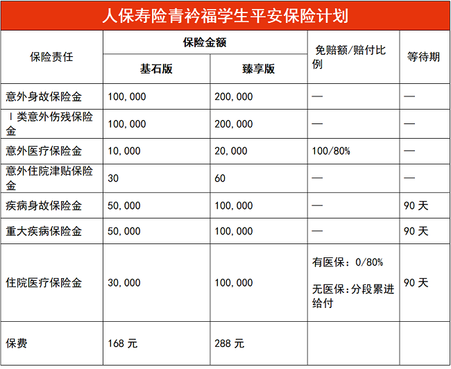 注:本产品适用条款为《人保寿险安祥意外伤害保险(B款)》、《附加学生平安重大疾病保险(C款)》、《附加学生平安定期寿险(A款)》、《附加学生平安住院医疗保险》,关于免责条款、保险责任等合同重大事项,建议您浏览公司网站查询完整条款。